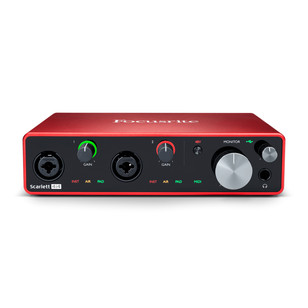 Focusrite Scarlett 4i4 - 3rd Generation. The perfect audio interface and best selling. Design for home and studio recording featuring 2 mic & 2 instruments inputs.